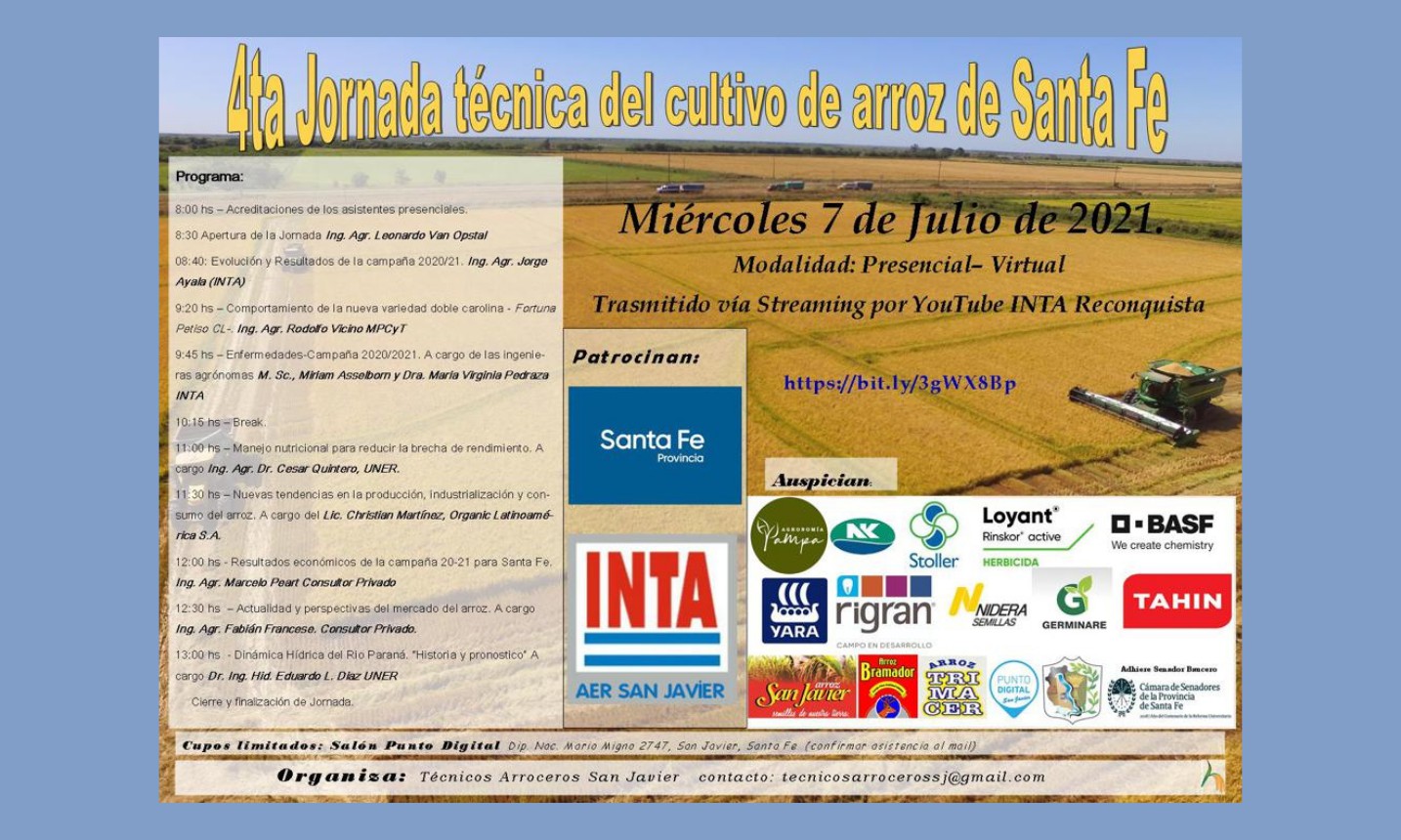 El miércoles 7 de julio, a partir de las 8:00 horas, tendrá lugar la Cuarta Jornada Técnica del Cultivo de Arroz de Santa Fe, organizada por la Asociación de Técnicas de San Javier, con la doble modalidad presencial-virtual. Transmisión vía streaming por YouTube INTA Reconquista: bit.ly/3gWX8Bp