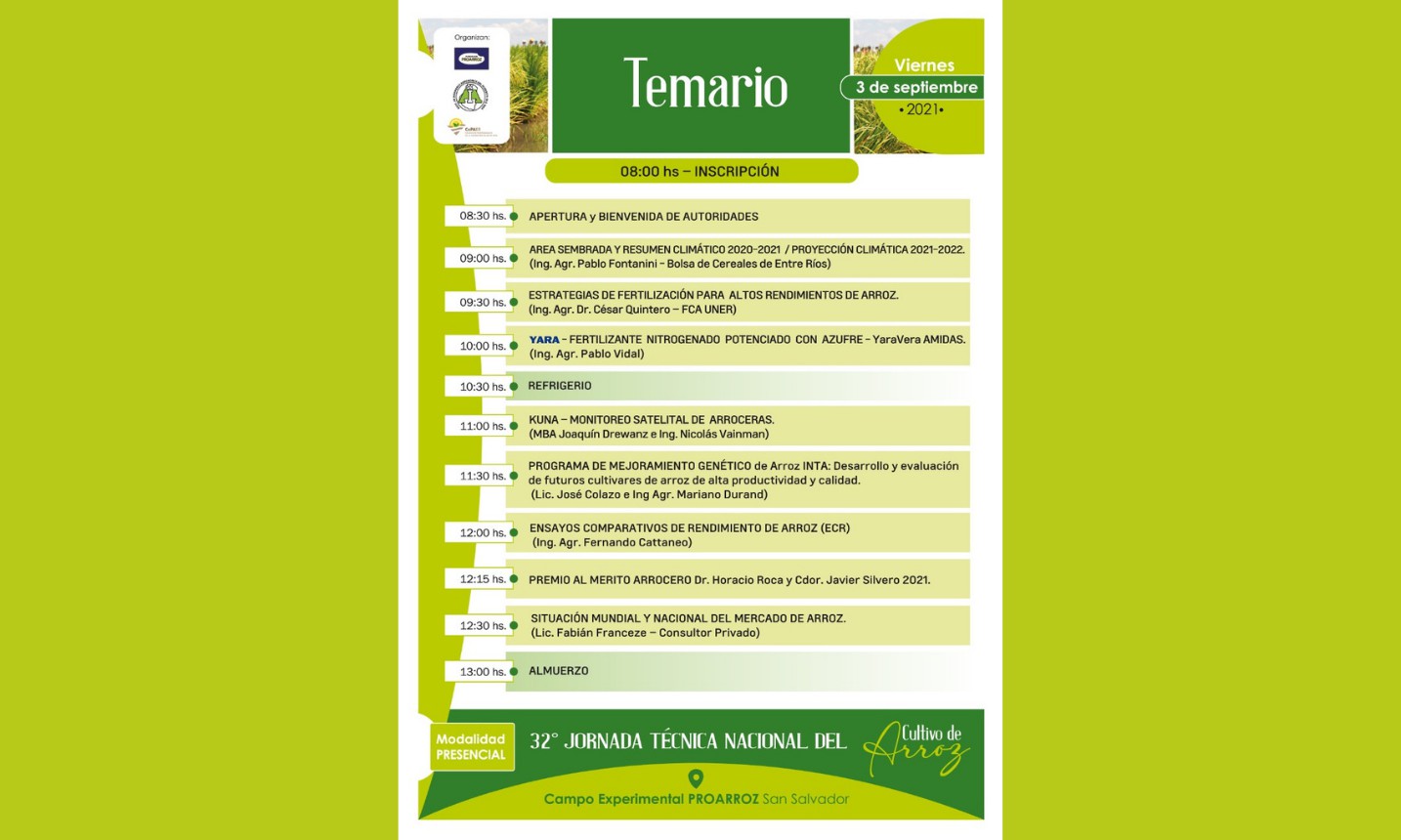 El próximo viernes 3 de septiembre, a partir de las 8 horas, en el campo experimental en San Salvador, Entre Ríos, se llevará a cabo la 32° Jornada Técnica Nacional del Cultivo de Arroz, en cumplimiento del distanciamiento social y demás protocolos sanitarios requeridos. El tradicional encuentro anual del sector, que incluirá disertaciones de reconocidos especialistas en distintos aspectos del cultivo de arroz, será con cupos limitados.